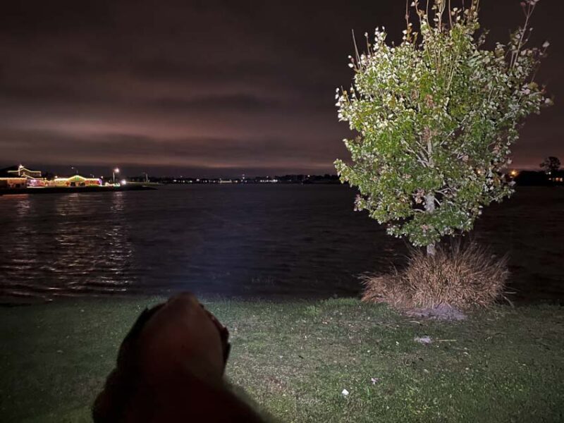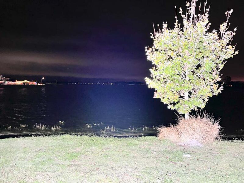 Above: 2,000 lumens vs 80,000 lumens. Note the center of the beam is directed to the left of the tree.