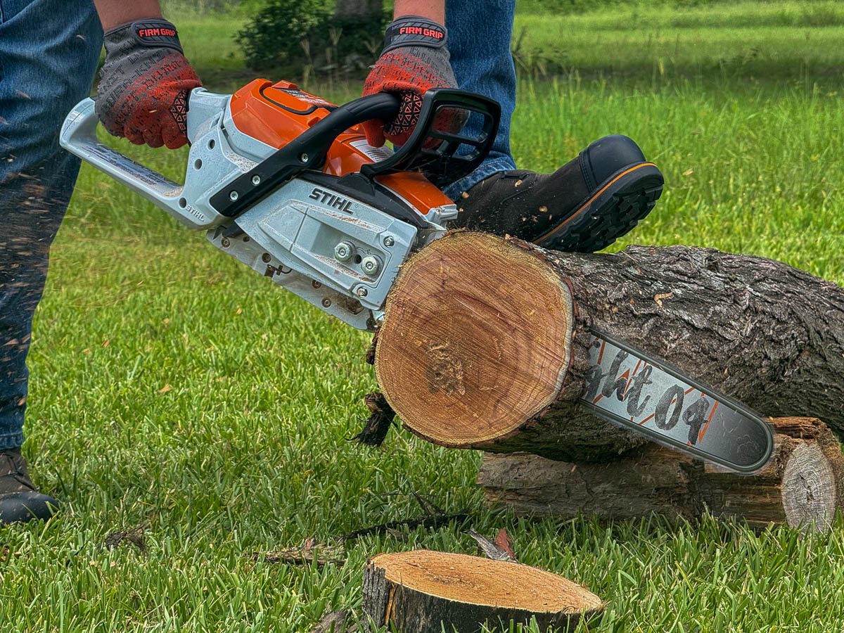 Side-by-side, you’ll notice that you can lean into your cut more with a 40cc gas saw using a 0.050-inch chain compared to a 40cc battery saw with a 0.043-inch chain. Both will get the job done, but the gas saw will feel more confident, especially when cutting hardwoods.
