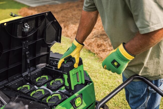 While most of John Deereโ€™s OPE roster is gas-powered, the brand joined forces with EGO to create the Z370RS Electric ZTrak zero-turn mower, which is powered by 56V Power+ batteries. This model is the first John Deere electric mower to employ removable batteries, and you can use the included batteries to power other EGO lawn care tools.