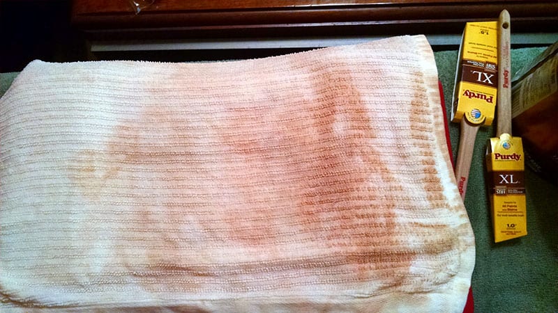 Here is the towel I used for the rinse and you can see that some of the paint was removed in the process. Despite my best efforts with 180 grit sandpaper and dust collection, there was still a need to clean before putting a fresh coat of paint on.