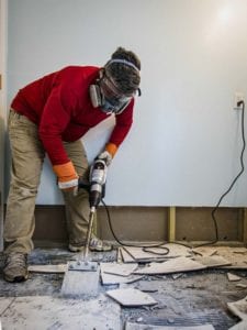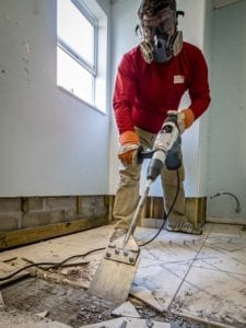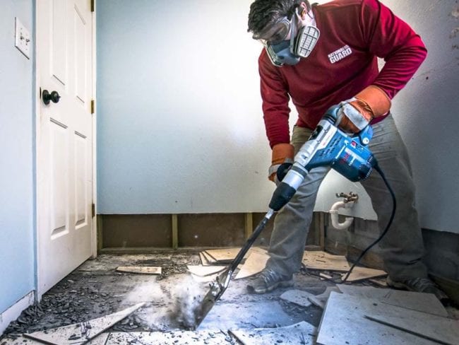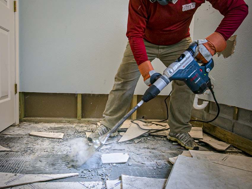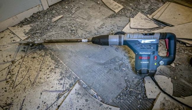 We had a couple of different tile jobs going on and the first step was to take out the old stuff. There are plenty of options, but we paired this Bosch combination hammer with an SDS-Max scraper.