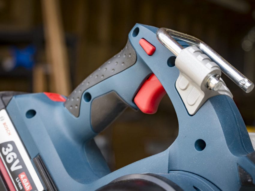 A couple notable features are missing. Thereโs no LED light for your cutline or bevel stops. Itโs also only sporting a 6-1/2-inch blade. Most newer models on both 18V and 36V platforms have 7-1/4-inch blades. We wonโt call them omissions because the fact of the matter is that they werenโt widespread when this model first came out.