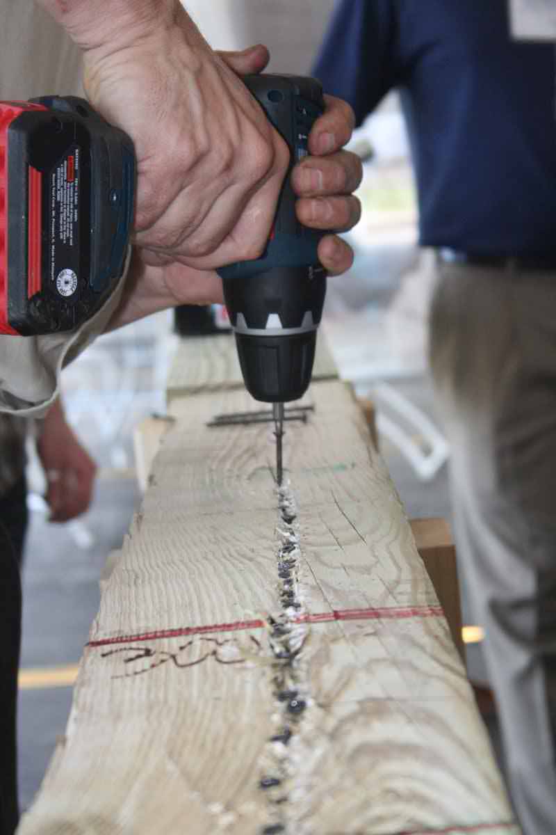 Bosch HDS180 Hammer Drill-DriverNick wasn’t done yet, but added Brian Triplett, also a Product Manager for 18V Lithium-ion Tools to the stage. Brian unveiled the new Bosch Compact Tough HDS180 Hammer Drill/Driver and Bosch Compact Tough DDS180 Drill/Driver – products we’ve been waiting for since last year’s event showed them off in early form. These tools really push the limits of size-to-weigh ratio. Compact size and lighter weight with power is the design goal. Based on our own use of these tools, I’d say they really pulled it off and achieved their goals. Feedback from construction professionals (and we’re inclined to agree) indicated that cordless drills in general are are too heavy, too big, and do not provide enough run-time. On top of that, pros wanted a better balanced grip, more ergonomics, more power, and durability for rugged jobsite conditions. They basically wanted a tool that felt good to use, would do its job well, and didn’t have to be babied. We used these tools extensively, even performing a competition of sorts to see how well the new HC high capacity batteries stood up against RedLithium and other Li-ion batteries. Bosch’s Compact Tough Drill put in 519 three-inch screws into lined up pieces of 10×10 lumber before it ran out of juice. The nearest competitors were Milwaukee with 423 and Makita with 399. DeWalt drove in 318 screws.