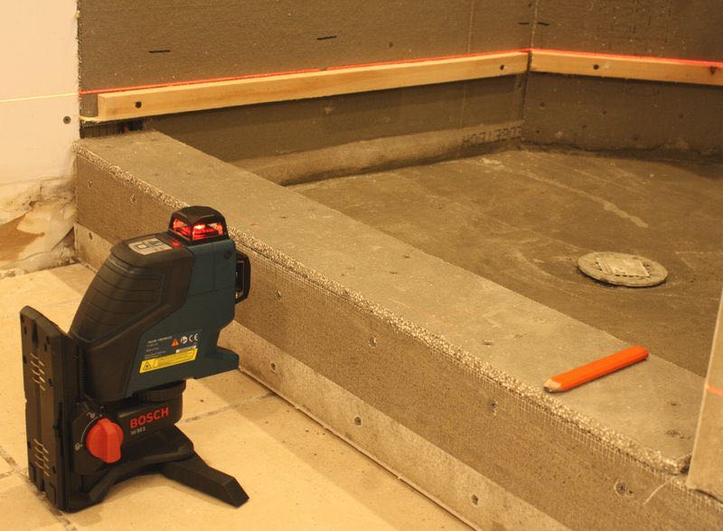 In this particular shower that we were going to tile, we had an angled corner seat and some other intricate areas that we needed to get into. With the laser level set to the front side, a nice bright line projected around all the walls of the shower. In this particular application, having the smaller size body of the GLL2-80 was a huge help since we were already working in tight quarters. The setup of the laser line was so simple and straightforward, which really speaks to the overall productivity that this tool can provide. No training or trial and error here; it was easy to just whip out the GLL2-80 and go to town on our project.