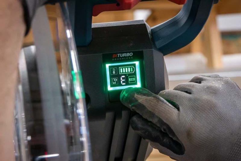 Unlike most miter saws, Bosch actually gives you some power options to help you get more of the battery. There are four speed settings to cycle through, including an ECO mode. We were able to cut through everything we tested using the ECO mode, but thereโ€™s some wisdom that comes into play. Softwoods such as pine and fir are one thing, just keep that speed up to get the best cuts in your hardwoods. Here are the no-load speeds: