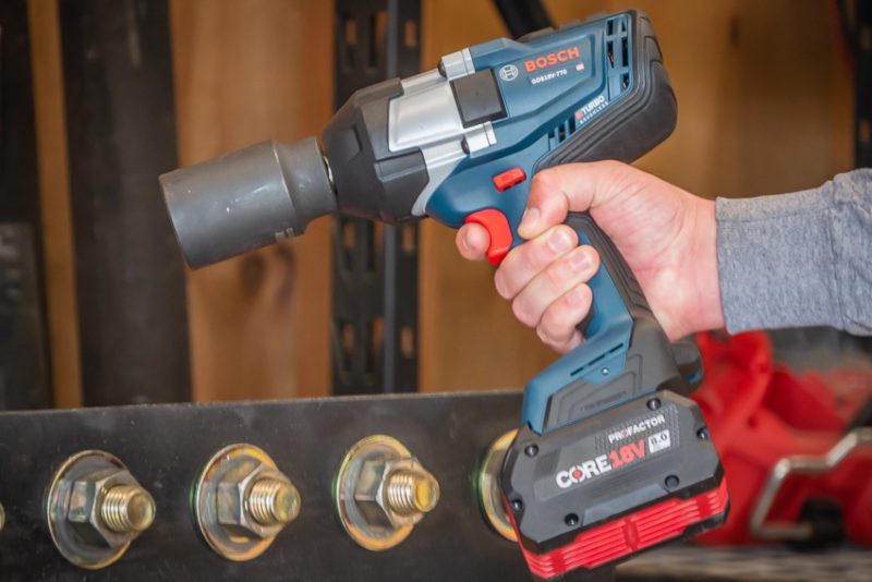 We took the Bosch GDS18V-770 out into our shop to find out how this impact wrench compares to what weโ€™ve tested in the past. On our test rig, we tightened a few 1-1/2 inch Grade 8 nuts to 700 ft-lbs with our Gearwrench electronic torque wrench. The Bosch ProFactor high-torque impact wrench broke them loose in a matter of seconds. What it didnโ€™t break was a sweat.