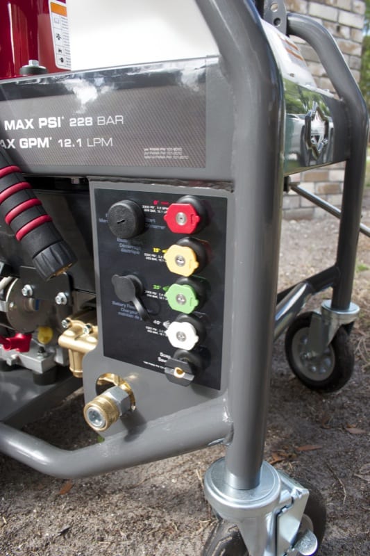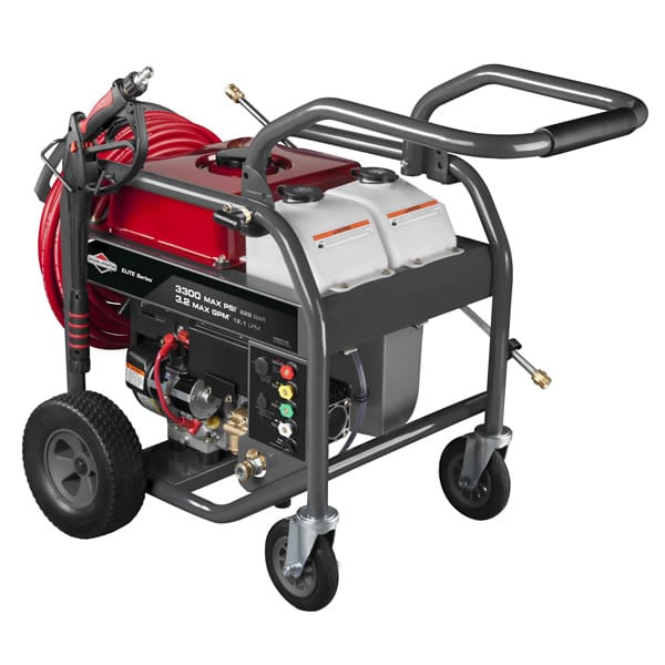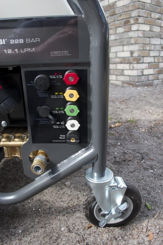 Also, I look for it to have good grab handles so I can lift it up into the truck and move it around easily on rougher job sites. The Briggs & Stratton 3300 has the four wheels, and since even the fronts are 5โ€ณ in diameter, I could pull it over tree roots and bumpy sod with no real issues. I had one a while back that was just way too big, so now I appreciate a more compact pressure washer that still has the power I need.