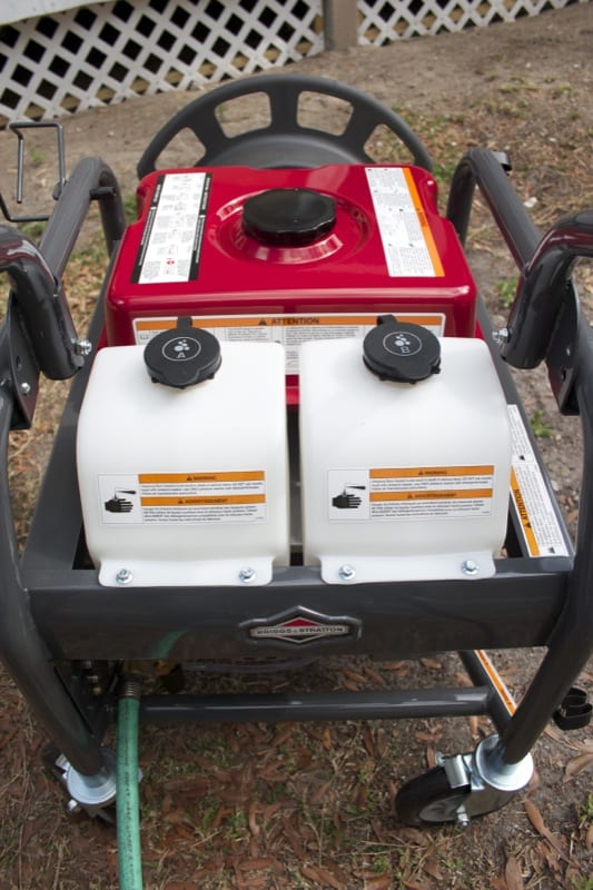I also liked the two self-contained [1 gallon] solution reservoirs. They are actually built right into the pressure washer, which is pretty cool. You could, for example, switch between soap and bleach, and the amounts can be regulated using the control underneath. With that, you can dial it back so that you donโ€™t blow through all of it too quickly. The way itโ€™s set up you can use undiluted solutions because the Briggs & Stratton will mix it for you with the incoming water. It just makes everything simpler and you can avoid carrying around a bucket and a siphon adapter. You also get the added benefit of not having to shut down the system and release the pressure to take it off. So you can imagine, having the self-contained system is rather nice.