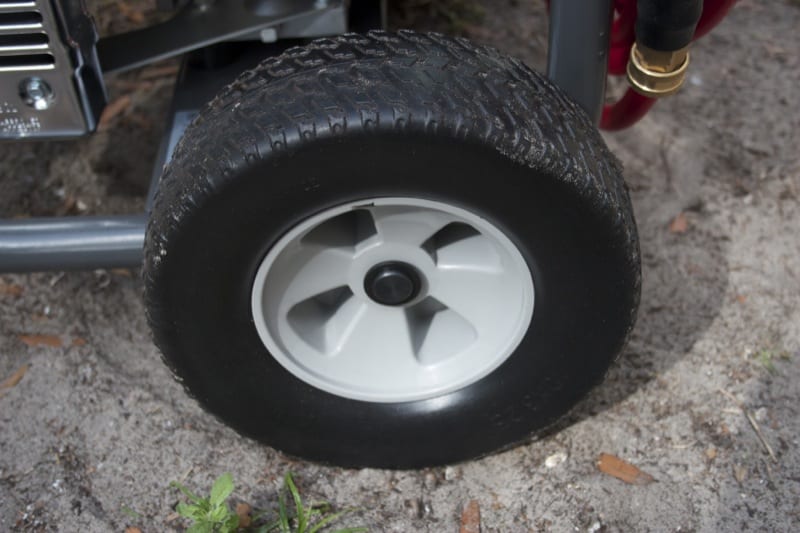 IMG_9026Rick: Iโ€™ve got just two wheels on most of the pressure washers Iโ€™ve used. I first thought that the 3300โ€™s four wheels would make it a little more difficult on really rough terrain. It actually did quite well. For sidewalks and driveways, itโ€™s remarkably easy to use. The handle also has several positions you can put it in, depending upon how you want to maneuver it.