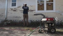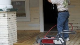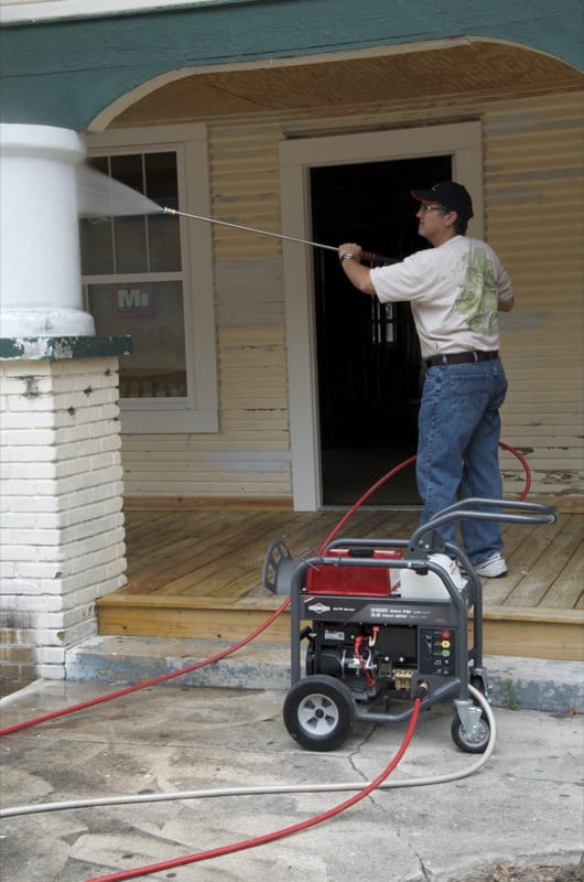 _DSC2530Rick: The prep process is the most important part of painting. A lot of people donโ€™t understand just how important it really is. Pressure washing is a big part of your prep, and it does several things. It, of course, cleans road film, pollution stains and mildew off of the house. But when youโ€™re using sodium hypochlorite (chlorine), it can help lift already unstable substrates on the house that are already suspect. That means that when you rinse the home you may end up blowing a fair amount of loose paint off the house. Of course, what you donโ€™t want to do is damage the wood in the process. A good pressure washer gives you a good jump on the prep work and is flexible enough to allow you to do so without damaging the material.