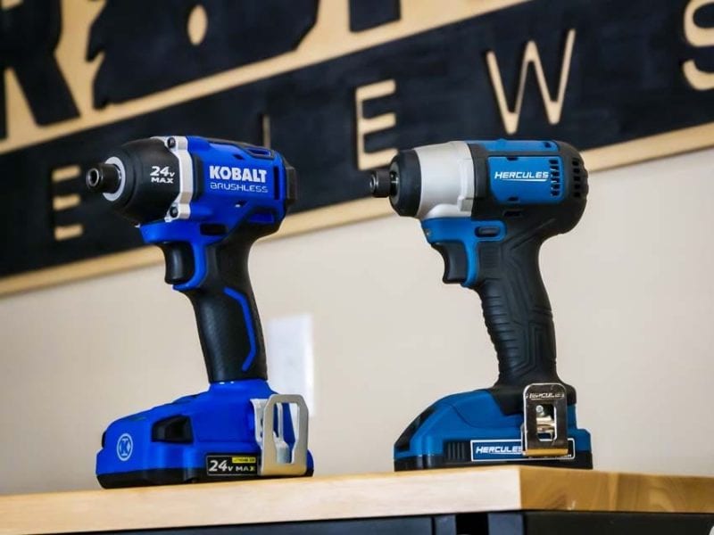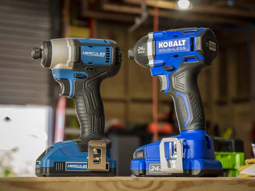 The Kobalt brushless 24V impact driver comes with a 2.0Ah battery while the Hercules has a slightly higher capacity with a 2.5Ah pack. Kobalt Tools uses an extra cell in their system so the watt-hour comparison is pretty close: 43.2Wh for Kobalt and 45 for Hercules.