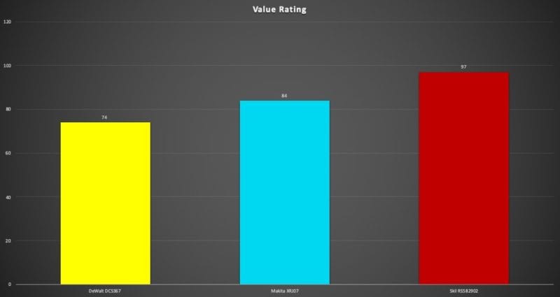 For the two-handed models, Skilโs price is so much lower than DeWalt and Makita that it earns the highest value even though it has a much lower cutting speed. While DeWalt and Makita both score lower in value, theyโre both worth considering.