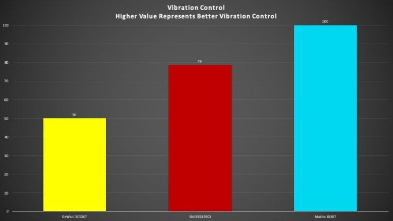 Vibration ended up being a more subjective test. With all of our test materials available, we sent out a team of three (Tom Gaige, Clint DeBoer, and myself) one at a time to cut to their heartโs content. Each tester then ranked each compact reciprocating saw on a 1โ4 scale. Once each of us had our results without the influence of the others, we tallied them up and averaged them out.