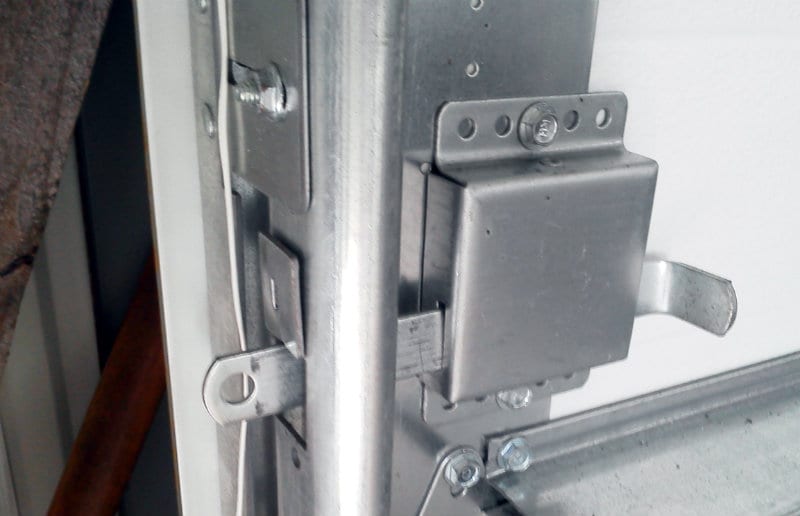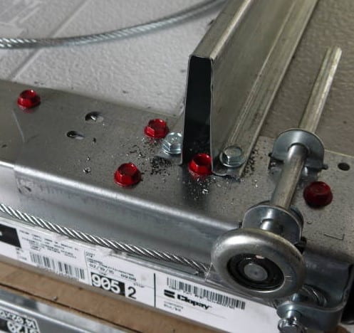 Beware of red-headed screws, especially on a garage door. During the installation, I noticed that the bottom roller hardware was installed with the same hex-headed screws as the rest, but they were painted red on the bottom of each doorโfire-engine red. I asked the obvious question: Whatโs with the red screws? Remember when I mentioned that the big door weighed 580 pounds, and remember when I mentioned the 9-1/2 full turns of the huge spring? Well, this brace with the red screws is where the cables terminate to raise and lower the doors; hence, over 580 pounds of pressure pull on these red screws. Donโt take out these screws!