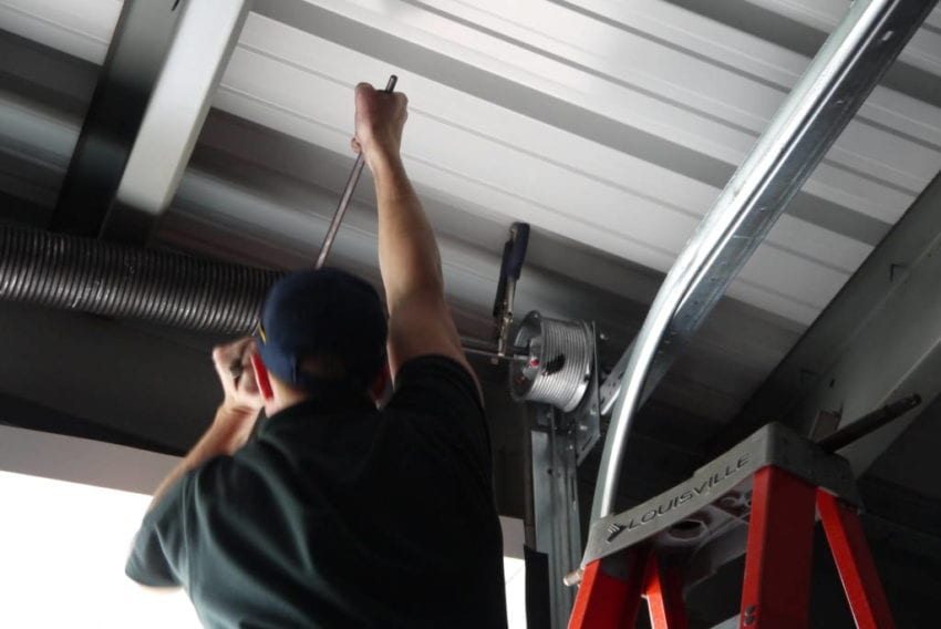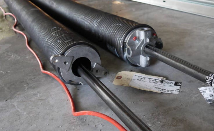 They first installed the tracks on which the doors would ride. Once the tracks were installed, then the associated lift springs were mounted in place. Clopay has already calculated the number of turns required for each spring in order to raise and lower the respective door with ease. In our case, the large 12โฒ x 14โฒ doorโall 580 pounds of itโneeded 9-1/2 full turns of the spring. That equates to 38 quarter-turns using two 3-foot steel breaker bars for leverage. The smaller door took a little less persuasion, but you still must respect the potential energy just itching to burst out.