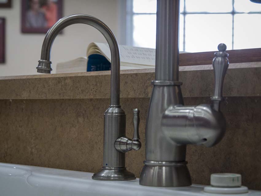 By design, youโ€™d want a sink with a hole at the extreme right. Thatโ€™s the perfect location for theย Franke water filtration faucet. Ours, however, lacked that, so we were forced to mount it to the left of the Frankeย Farm House FHPD180 Satin Nickel faucet. While not ideal, it allowed us easy access to both faucets without the handles being in each othersโ€™ way. As we had a ceramic-coated sink, we couldnโ€™t simply add a new hole.