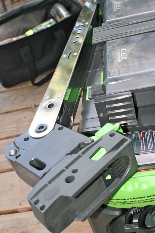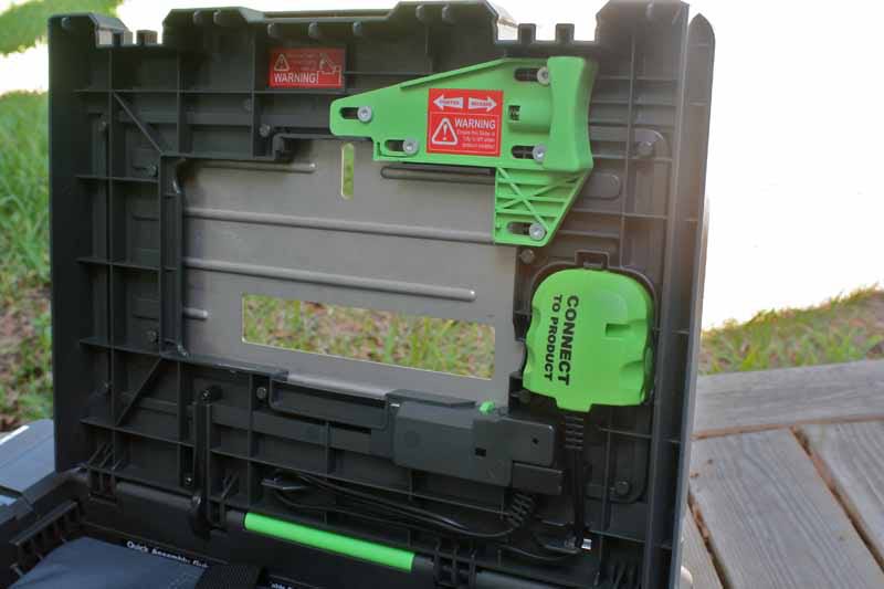 Below the slide is the removable power feed that connects energy from the attached Powerhandle to the tools and allows them to be operated in bench-top mode. Once connected, power to the bench-top is activated not by the Powerhandle, but via the use of the red and green controls to the left of the table. You can also connect the Power8 Workshop to a standard 120VAC outlet (there is a convenient cord-wrap), and it also includes a separate secondary charger port that can refuel a Powerhandle while the saw is plugged in. While you canโt recharge two batteries at once, itโs still a convenience.