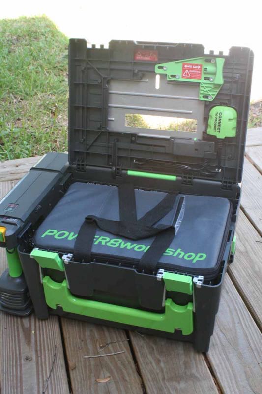 Nothing is wasted on the Power8, and you can quickly tell by looking at it from all sides that it was carefully engineered with no wasted space. Within the hinged case was a canvas bag that held the tools and the extra Powerhandle. Looking around the case, you can see that the level/rip fence is integrated into the bottom of the case and can be removed as needed, while the left side of the tool is dedicated to charging and being powered by the Powerhandle and the dedicated on/off controls.