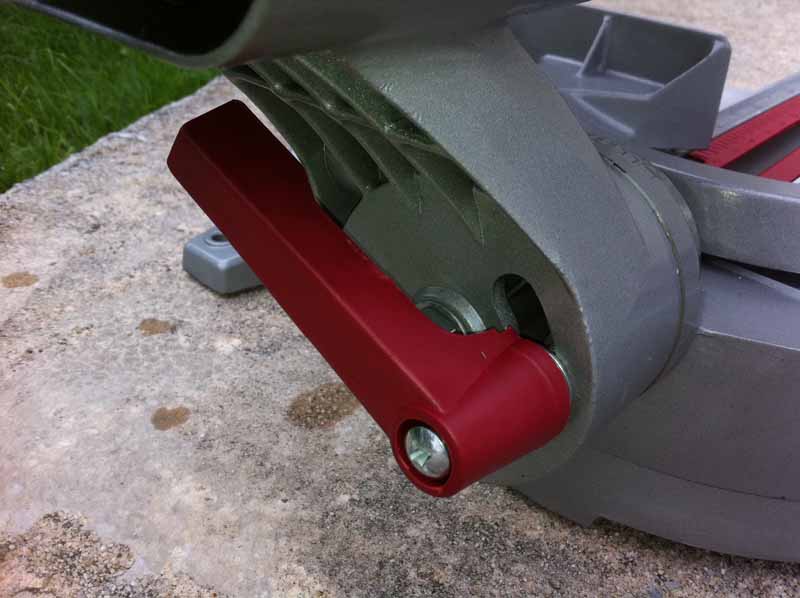 The rear bevel control lacks any positive stops and itโs a bit difficult to use, particularly since itโs located on the rear of the saw. The imprinted bevel miter gauge looks like it goes past 45 degrees, but it doesnโt.ย Youโll want to let the blade tilt to get a correct 45-degree angle and we suggest adjusting the bevel angle measurement pointer with a Philips screwdriver to make sure other angles are accurate. You also have to hold the saw in place while you reach around and pull the locking lever in place for any other angle. The bevel gauge is in 5-degree increments, so it will be difficult to dial in common measurements like 22.5 degrees.