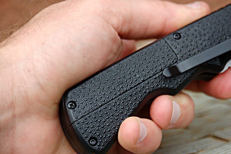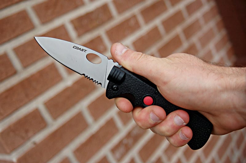 The Coast Light Knife starts with a 7CR17 stainless steel blend. Itโ€™s ground to a partially serrated, single edge spear point. Okay, letโ€™s get this out of the way first. 7Cr17 is similar to the 440A steel. Itโ€™s got a higher Vanadium concentration to it that increases hardness and tensile strength. It pulls a hardness rating of 55 โ€“ 57 HRC. The not so great news is that high end knife makers tend to stay away from this blend. However, weโ€™re looking at a sub-$60 combination light and knife,ย notย a high end EDC. Plus, this blade comes very well sharpened out of the box.
