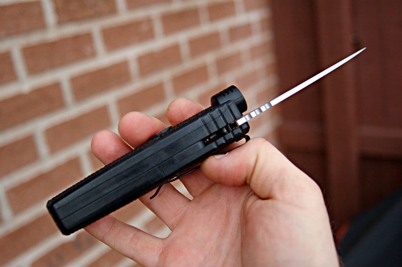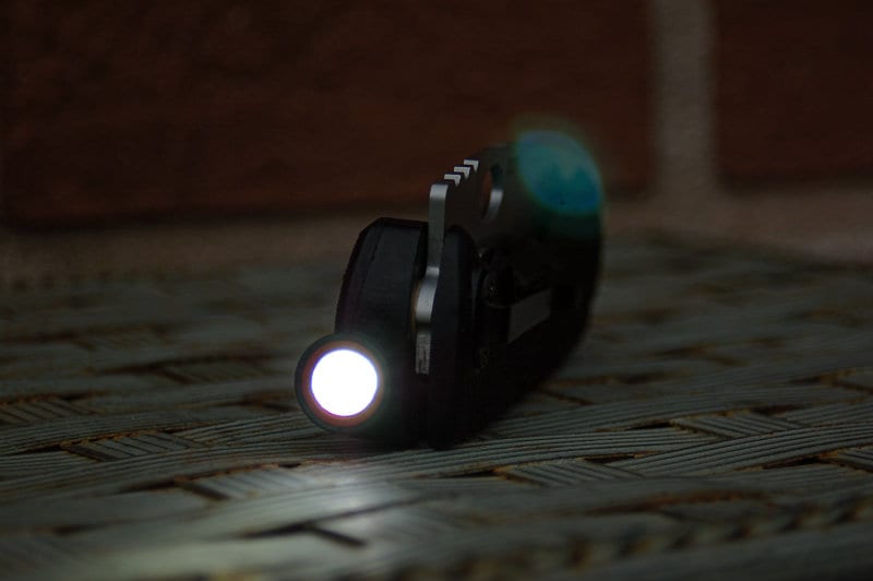 The beam has a large hot spot with substantial corona and side spill. Itย has a fairlyย symmetrical throw that I was pleasantly surprised to find on this combination light and knife. ย Also a surprise, the beam is only slightly impeded with the blade deployed. It also makes for an excellent guide in low light situation whether youโ€™re piercing with the tip, slicing with the plain edge, or tearing with the serrations. By clicking the light on, off, then on again, youโ€™ll switch between low (29 lumens) and high intensity (110 lumens). This can also be achieved with a half click.