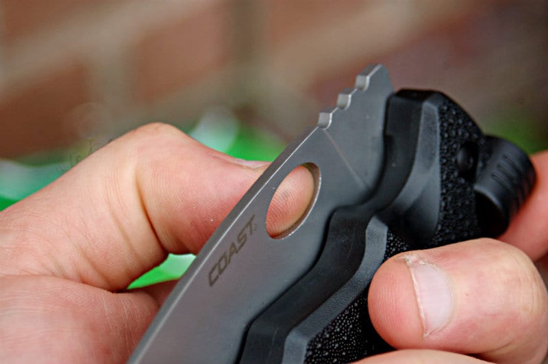 One handed opening is possible with the Coast LK375. A large thumb hole helps in that regard. However with the light assembly on the right, one handed deployment will likely be easier for lefties. Personally, I resort to a two handed deployment as a right handed user.
