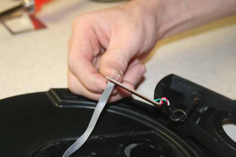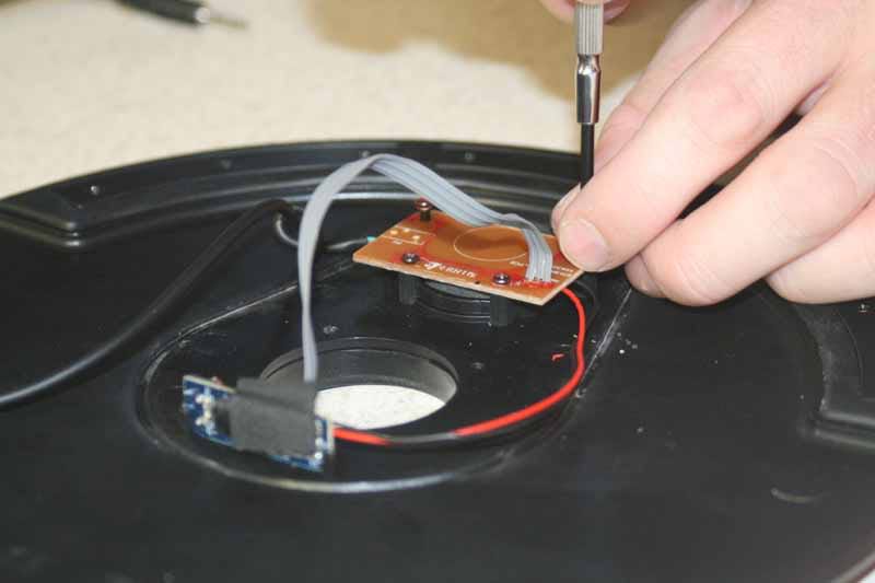 After you realign the pads, replace the sensor, being careful to guide the wires around the edge of the area where the plastic case will be re-attached to the cymbal body. Replace the four screws that hold the sensor in place and replace the plastic casing.