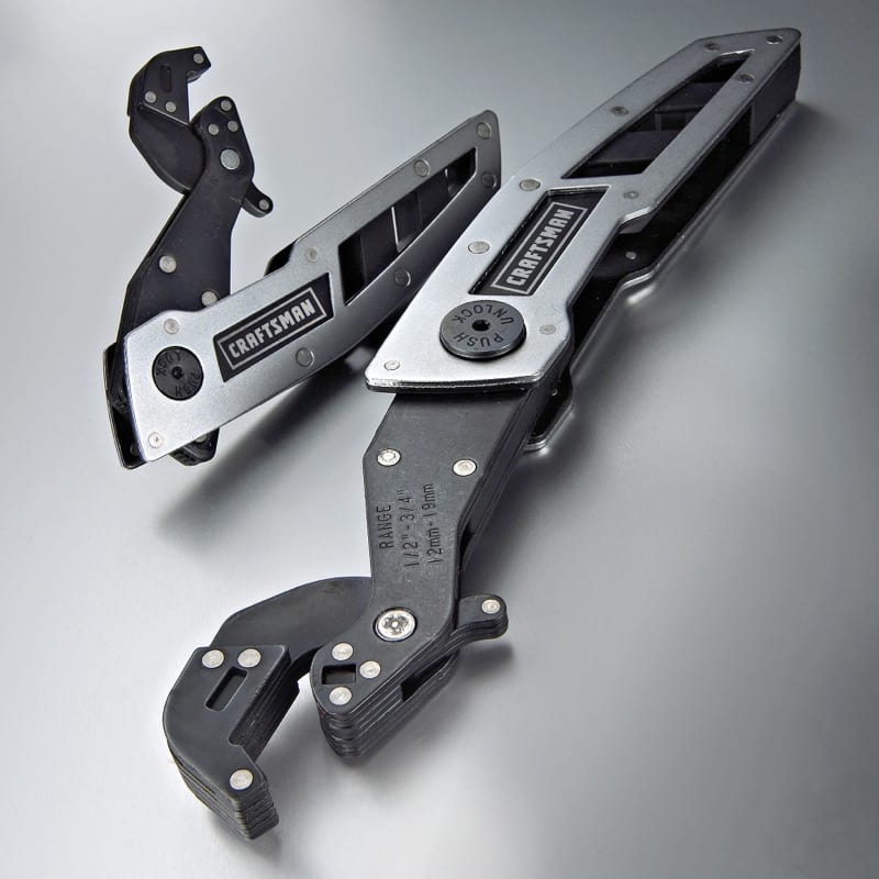 The Craftsman Clench Wrench is an oldie, but goodie that we stumbled across the other day and had to share. It’s one of the more unusual tools we’ve seen in a while. It’s unusual because it’s a folding wrench. It’s unusual because it’s auto-adjustable. It’s unusual because…well, it’s just unusual. The Clench Wrench uses the same principle as a traditional adjustable wrench, except that it’s made to bite hard and ratchet quickly without needing manual adjustment. Craftsman sells these in a two-pack (two different sizes).