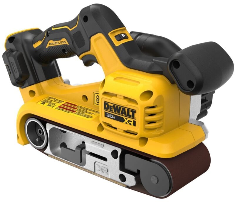 The DCW220B belt sander has a brushless motor and a variable speed trigger with 25 speed settings. Its speeds range from 650 SFM to 1050 SFM. DeWalt tells us it’s ideal for carpentry, remodeling, and other larger-scale sanding tasks.