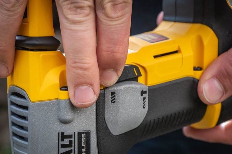 A 2-position slide switch on the side lets you alternate between hammer drill mode and rotary drilling mode. Unlike some other high-powered rotary hammers, DeWaltโs 20V Atomic rotary hammer doesnโt have a dedicated chipping mode for use with SDS Plus chisel bits. Thatโs not a slight against this tool, itโs simply not designed for chipping.