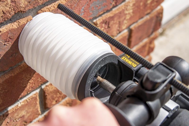 To get an idea of the performance and convenience of this vacuum system, we paired the DWH161D1 with the DWH200D dust extractor tube kit as we tested DeWaltโ€™s 12V brushless rotary hammer.