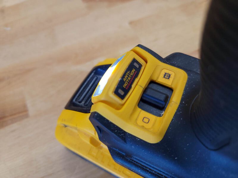 DeWalt made a big stride forward in terms of safety on this drill. The torque-sensing Perform & Protect Anti-Rotation system immediately shuts down the drill when it senses a bind-up, indicated by the LED work light turning red. This system will activate in forward and reverse and requires a much smaller swing arc to activate the anti-kickback system than weโ€™ve seen with other drills.
