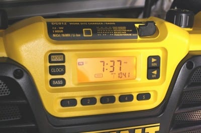 The DeWalt DC011 Radio Chargerย features an AM/FM digital tuner with LCD display and has a built-in clock. There are 4 buttons that will allow up to 8 station memory presets (4 per band). The volume and tuner knobs on the top of the radio are large and adjust easily, even with gloves on. The radio has both a seek and a manual adjustment knob but there is no way to adjust tone or bass. The radio and clock functions use two AA batteries (included) to maintain the clock and radio preset memory. The batteries are located in a separate area inside the battery charging compartment. The trouble with many smaller radios is the fragile collapsible antenna; this is not the case here as the flexible, rubberized 11โณ antenna has a durable pivoting base.