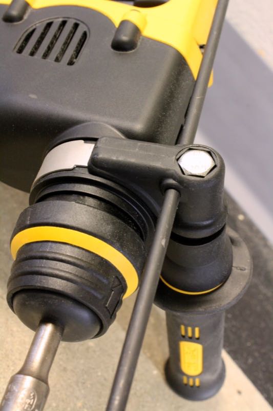 In addition to the new contoured shape, the entire grip is covered in a rubberized overmold. The convenient side handle, which you will want to leave on given the increased weight over a hammer drill/driver, is easy to adjust by simply twisting it counter-clockwise to loosen it up. It rotates all the way around the chuck, which will help you manipulate the rotary hammer into tighter locations as needed.