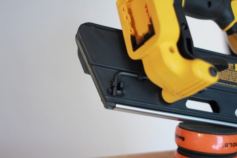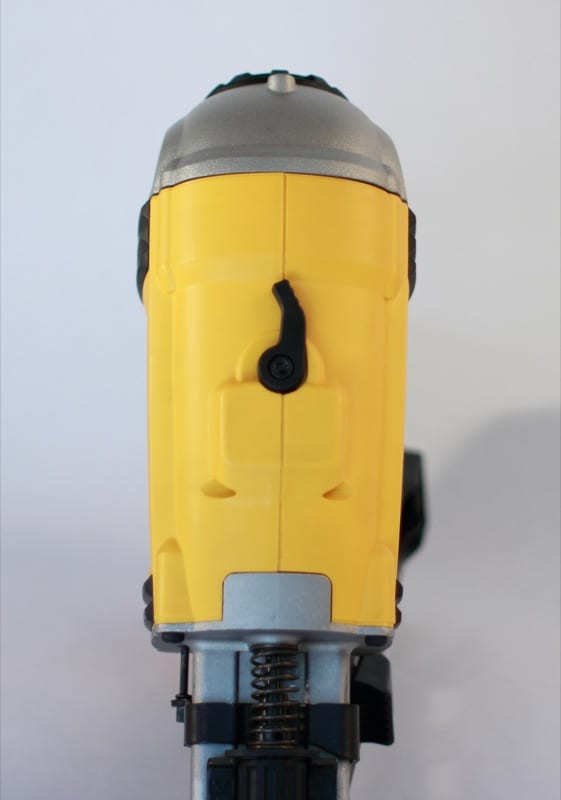 As strange as it seems, I got excited when I got to use this feature. That’s good and bad for DeWalt. When the plunger lodges in the down position, you simply turn this lever, and you can feel the blade slide back into firing position. Weirdly satisfying.