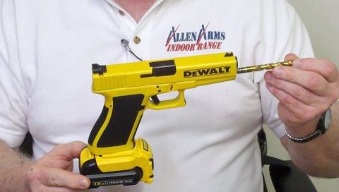 What happens when a DeWalt enthusiast decides to go for his concealed carry permit? Well, thereโs a slight chance you might get something like this โ although weโd have to wonder if this should result in a new โcamouflaged carryโ permit. Mark Bilicki, of Greenvilleโs Allen Arms worked with gunsmith Jamesย Oberkirsch to develop a fully-functioning DeWalt Glock 21 .45. Except that this one is styled to look just like one of the companyโs new cordless drillsโฆ complete with a drill bit emanating from the front of the gun, just below the barrel. While the drillย doesnโt work, the thought is that if you really want a hole that bad, the Glock can probably take care of it.
