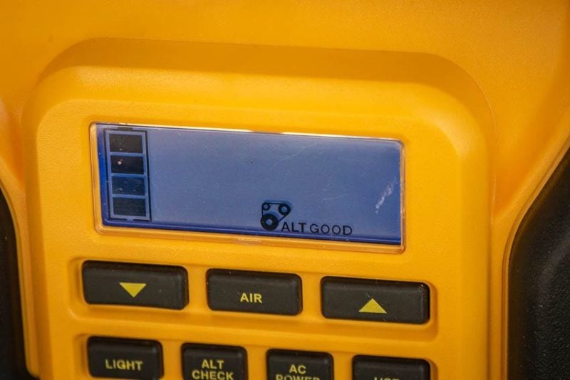 Whatโs really interesting about this unit is an alternator check. Like jumping your battery, the alternator check is simple. Hit the Alternator Check button on the DXAEPS14, and hook up to your fully charged battery with your engine running. The system will begin to assess your alternator voltage range. If everything is as it should be, the LCD screen will display an โAlt Goodโ indication. If thereโs something amiss, the system warns you.