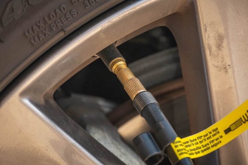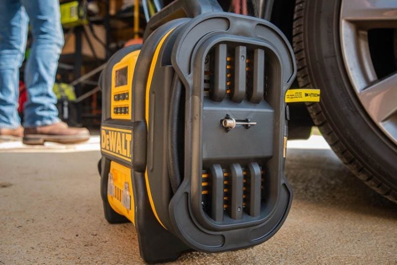 DeWalt uses what they call a SureFit nozzle at the free end of the compressor hose. This screws onto your valve stem instead of the clamp system that most inflators come with. In time, the rubber gaskets in a clamp have a tendency to wear out and leak. DeWaltโs setup is likely to last much longer.