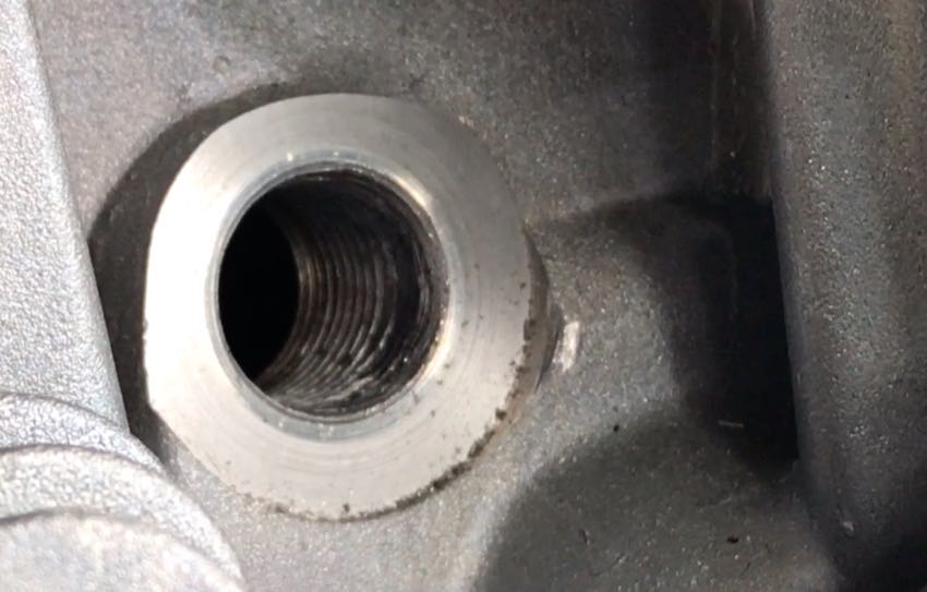 Hereโs where it all comes together. Using your socket and ratchet, carefully center your DIY spark plug thread chaser so it can enter squarely and reopen the damaged threads. If you come in at an angle, youโll cut new threads across the old ones and itโs game over.