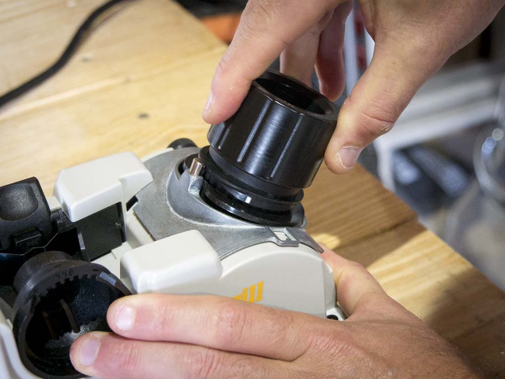Turn the Drill Doctor on and align either of the white marks (Sharpening Guides) on the chuck with the silver Cam Guide on top of the sharpening port. Start spinning the chuck with light downward pressure. You’ll notice a motion that’s kind of wavy – that’s what gives the bit the correct tip shape, so don’t try to overcome it.