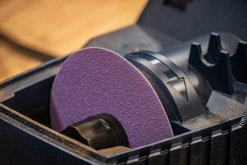 The sharpening wheel is a flexible ceramic disc rather than a solid stone and thereโ€™s a spare in the box. The benefit is that itโ€™s more forgiving than a stone if your angle of attack is a little off.
