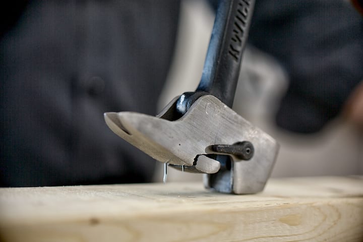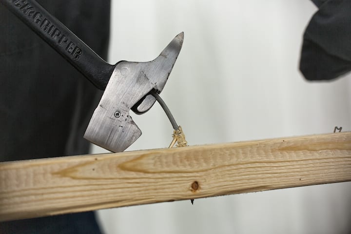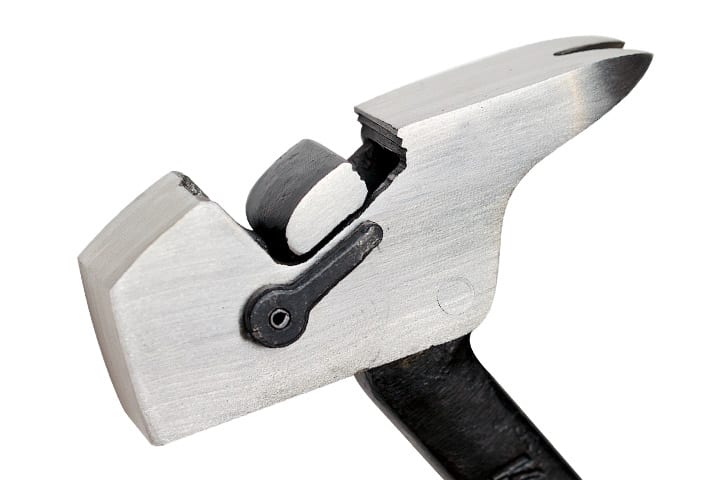 Finally, the cats paw-style claw on the back side of the KwickGripper lacks any real bevel along the gripping edge. That means that itโs simply a shaped groove through which any nail with a minimal head will slide right through. I tried using it to pry up some 2-inch 6d finish nails, normally an easy task for a traditional cats paw or even claw hammer. These nails just slid right through the groove on the KwickGripper. With our reference Powerstrike hammer, the small nail head locked into the beveled v-groove and came right out.