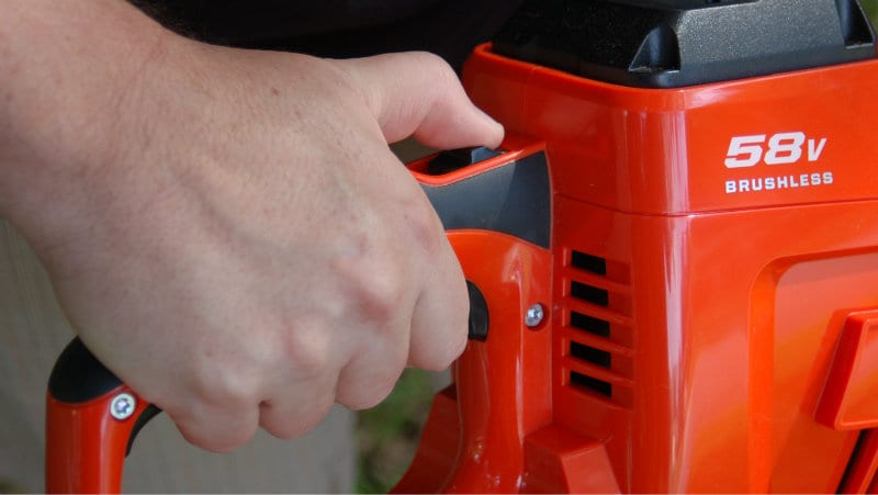 You have a couple of safety features to overcome before starting the Echo 58V Hedge Trimmer. I say that meaningfully โ they will feel like an obstacle until you get used to them. Youโll need to have one hand on the guide to depress the switch while the other disengages another safety with your thumb near the trigger. Itโs awkward at first, but youโll stop thinking about it after a few uses.
