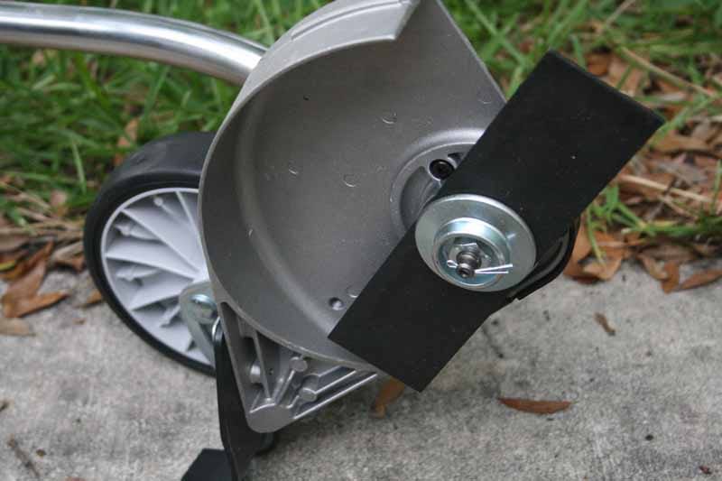 The “business end” of the ECHO Perfect Edge Edger uses an 8″ blade (nearly 1/10-inch thick), which is shrouded by an open-faced die-cast aluminum debris shield. The blade is simple to remove when it needs to be replaced (no sharpening is required, of course, on edger blades), and the unit comes with an additional cotter pin for securing a replacement blade. The rear wheel worked really well in its stock setting, but you can adjust the height with the turn of a knob to slide it up and down and achieve the perfect cutting depth.