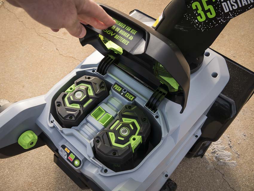 To start the EGO 56V snow blower, you just go through a few easy steps. First, openย the side rails andย lock them in place. Next, insert a couple of batteries (at minimum, EGO recommends a pair of 4.0Ah packs, but you can also mix and match). Close the battery cover. Next, you justย press the safety button and then squeezeย the bail switchย toย the handle. You can release the safety button onceย the snow blower isย ย started.