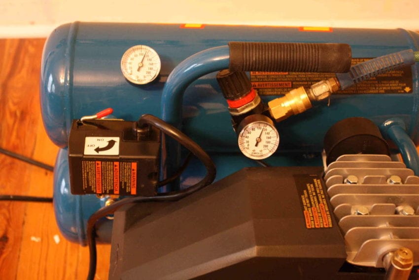 The compressorโ€™s controls are logical and easy to access. We plugged it in, turned it on, and let it go. In a relatively short time, the twin tanks were full to the compressorโ€™s shut-off pressure of 125 PSI. Since we were using the compressor for shooting 2-1/2โ€ 15-gauge trim nails, in the course of our nailing, the compressor only had to cycle a few times, which it did quickly and with minimal noise (since it is oil-lubricated).