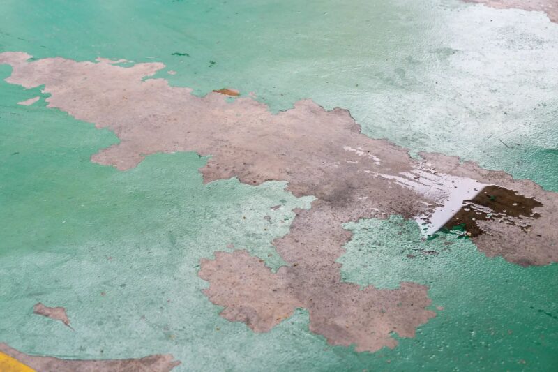 You must remove all oil spots and clean and degrease the floor to remove residual chemicals. Then, it must be scrubbed and vacuumed to remove any loose particles or dirt.ย