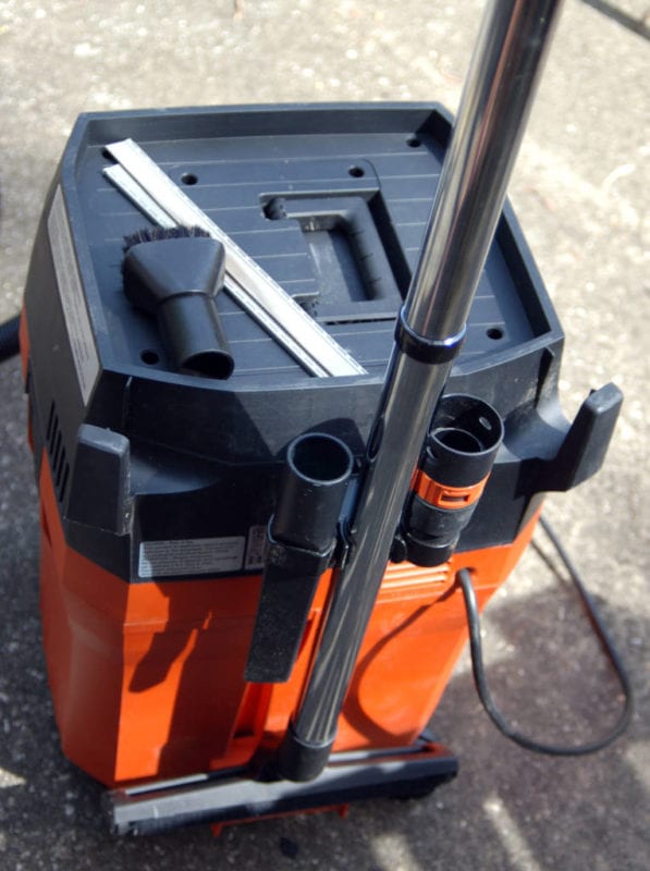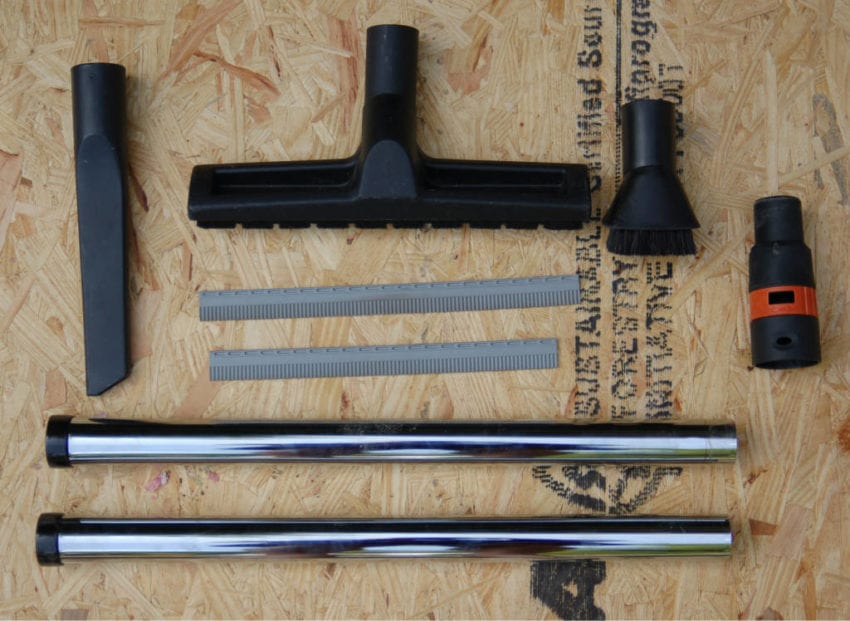 The unit comes with a HEPA filter and a filter bag, the hose, a tool coupler with suction control as well as the items that distinguish the dust extractor โsetโ from the dust extractor alone: two metal extension tubes, a crevice tool, a dusting brush, an elbow, a combination nozzle with rubber blades and brush strips for wet or dry work, and the nozzle holder/floor nozzle holder combination for carrying the accessories.