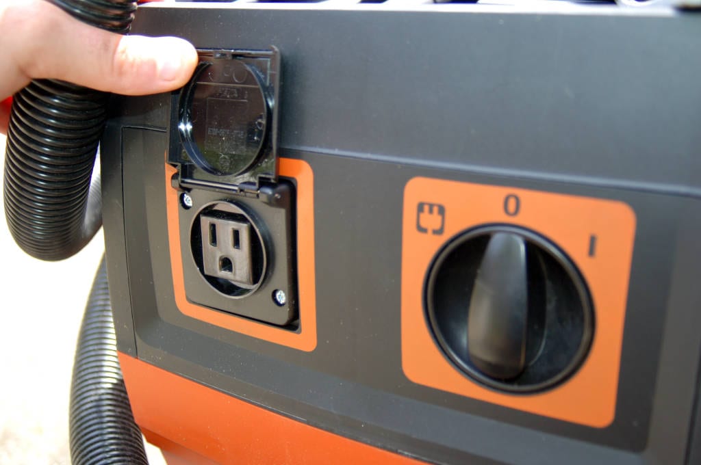 ย The 27mm diameter tool coupler with suction control is the accessory used in dust extraction process. ย This coupler fits all Fein tools with a dust extraction port as well as some other power tools, although itโs not universal. ย In combination with the integrated socket outlet, this coupler is sure to be one of the most useful features of the Turbo II. ย Attaching a tool to the Turbo II using the coupler, plugging the tool into the integrated socket outlet on the Fein Turbo IIโs lid, and moving the the on/off switch to the plug symbol, the Turbo IIโs power is now controlled by the attached tool โ automatically turning off and on when the tool is turned off or on, and the dust generated by the tool is captured by vacuum. ย The Turbo II will run for about 15 seconds when the attached tool is switched off.