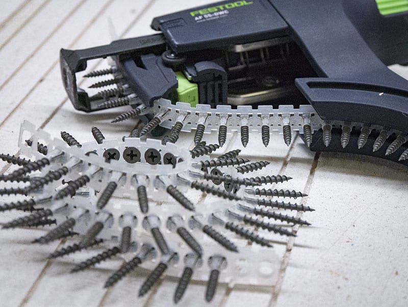 The Festool DWC 18-4500 Cordless Screw Gun comes with two 18V batteries and charger, several long bits, and a regular chuck that can be interchanged with the collated fastener magazine. I quickly understood the potential speed and efficiency improvements with the auto-trigger and 50 collated screws. The alternatives I mentioned โ corded screwguns and drills with driver bits โ seemed clunky by comparison. Of course, I hadnโt sunk the first screw yet.